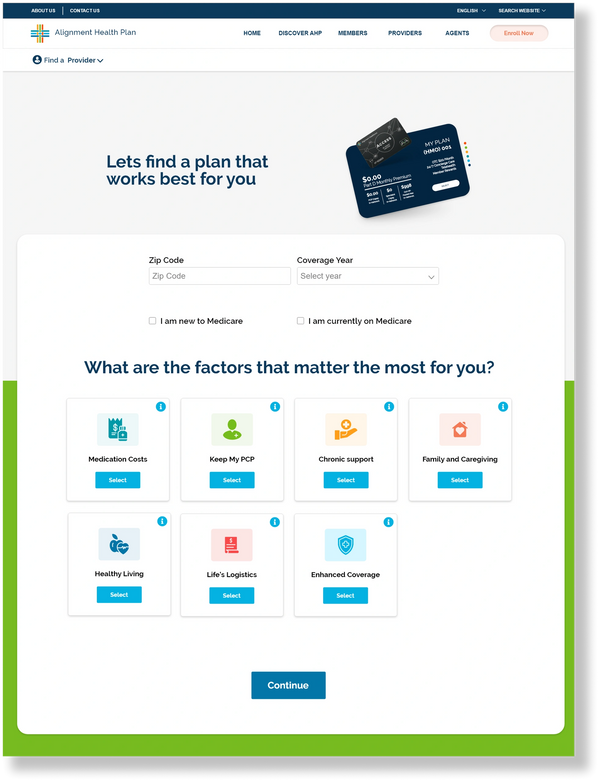 Summary: I led the UX strategy for Alignment’s first personalized, digital, self-service enrollment tool, designed to replace a slow, manual process that had long relied on mailed PDF packets and broker assistance. Seniors previously had no streamlined way to compare plans or enroll online. This platform introduced a guided, intuitive experience with plan search, side-by-side comparisons, provider lookup, and benefit breakdowns. While adoption remained low (only 3% opted for self-enrollment), the tool laid the groundwork for a scalable, future-facing solution. My role focused on transforming complex decision-making into a clear, accessible journey tailored to the senior population.