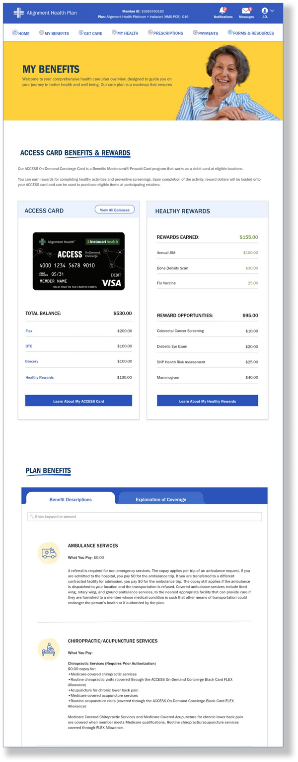 The Alignment Member Portal is being upgraded a centralized, user-friendly digital platform offering a wide range of self-service features, intuitive and better explained plan and benefits information. The portal aimed to streamline member interactions, increase portal adoption by 40% by providing easy access to essential healthcare services and information..